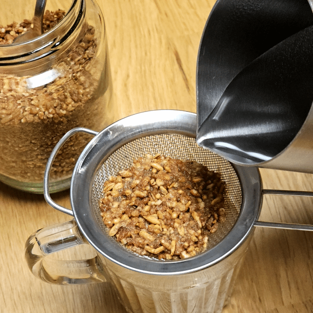 컵에 거름망을 놓고 곱게 간 누룽지를 넣고 커피 내리듯 뜨거운 물을 조금씩 부어가며